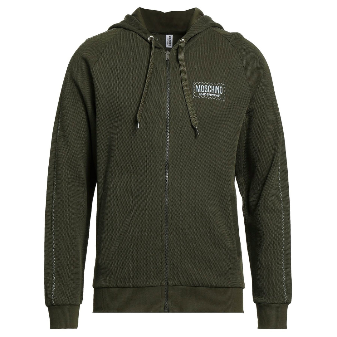 Moschino Sticthed Logo Green Zip Hoodie. Moschino Green Jumper. Elasticated Sleeve Ends and Waist, Drawstring Hood. Front Zip Closure, Front Pockets, Stitch Logo Design. Moschino Underwear Collection, 97% Cotton, 3% Elastane. Style Code: A1723 8130 0430