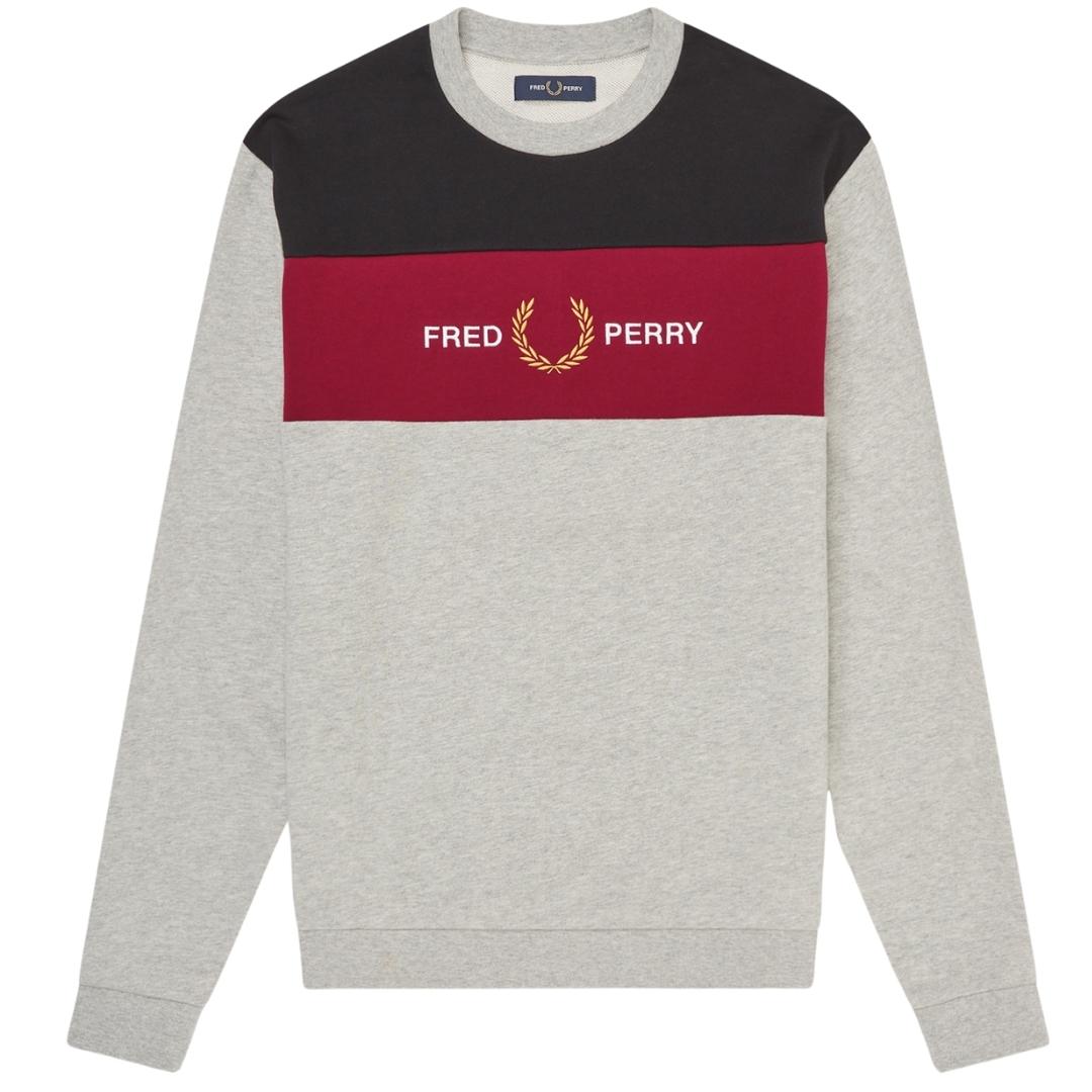 Fred Perry Colourblock M8597 127 Grey Jumper. Fred Perry Grey Sweater. 100% Cotton. Round Neck. Elasticated Sleeve and Hem. Style Code: M8597 127