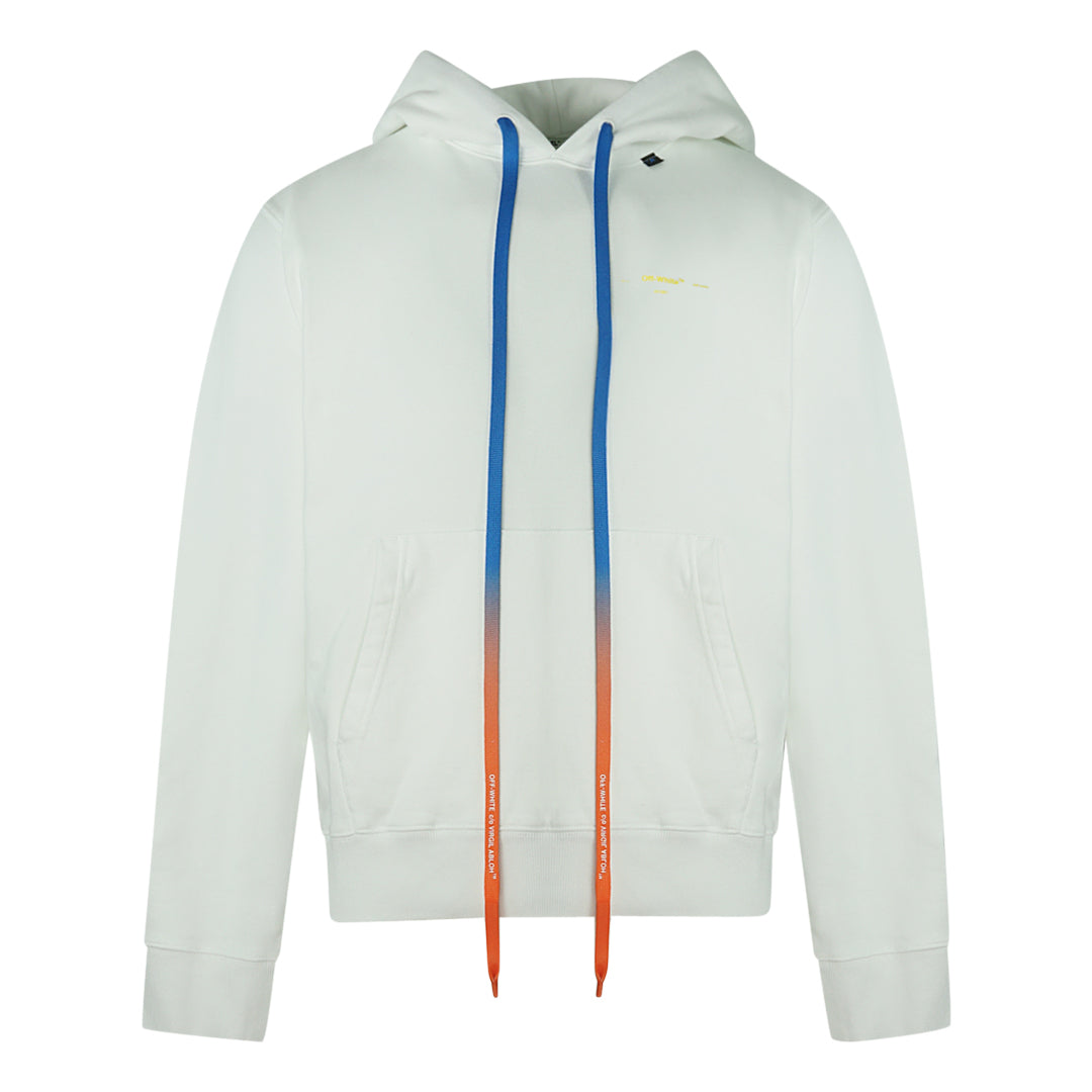 Off-White Long Drawstrings White Slim Hoodie. Off-White White Hoodie. Long Bright Gradient Drawstrings. Yellow and Black Arrow Design On Back. Drawstring Adjustable Hood. Style Code: OMBB034F19E300100160