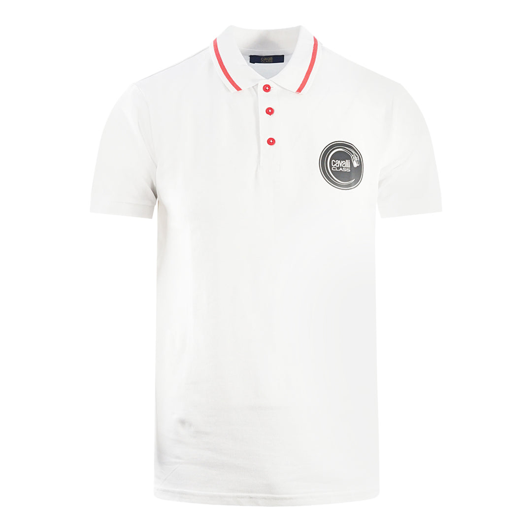 Cavalli Class Circular Snake Logo White Polo Shirt. Stay comfortable and fashionable in this Cavalli class polo shirt.. Single Tipped Collar, Short Sleeves. 100% Cotton. Regular Fit, Fits True To Size. Style Code: RXT64A KB017 00053