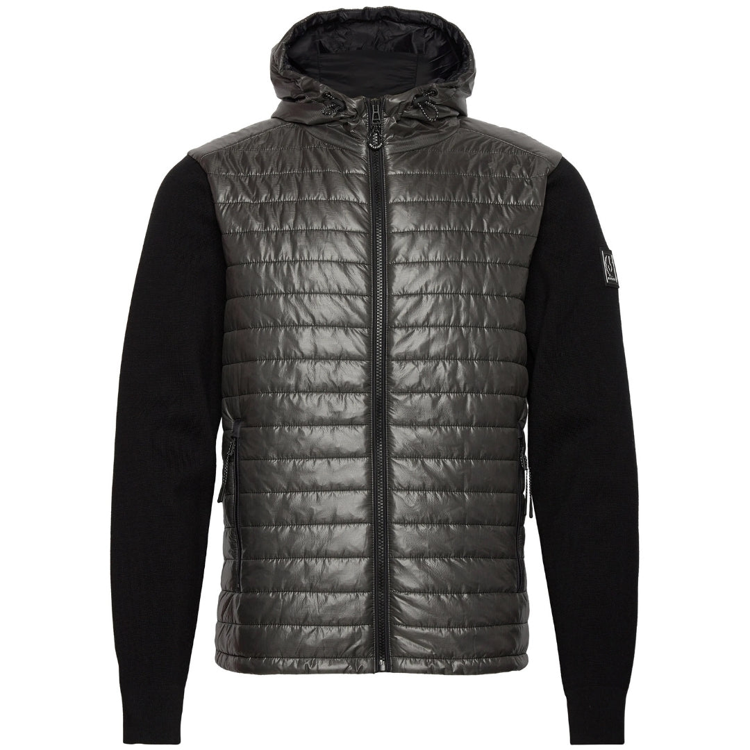 Belstaff Vert Zip Black Hooded Cardigan Jacket. Wrap yourself in comfort and style with the Belstaff Black Cardigan. Made with a jacket like material and featuring a sleek Silver design, this Cardigan exudes effortless cool. Stay warm while making a statement in this must-have addition to your wardrobe!. Material: 100% Polyamide, Filling: 100% Polyester, Full zip fastening, Alternative Knit Material is 100% Cotton, Padded Zip Through Technical Cardigan. Branded Badge On Left Sleeve, Lightweight, Phoenix patch on the sleeve. Zip Closure, Silver Jacket, Jacket Like Front Cardigan Back. Style: Vert Cardigan Jacket Black