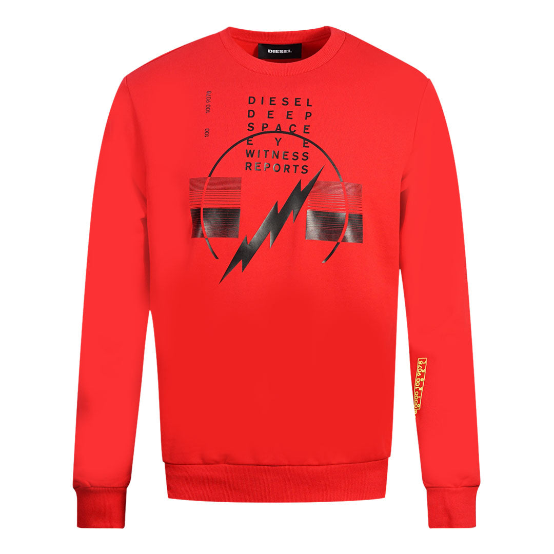 Diesel Deep Space Logo Red Sweatshirt. Diesel Red Jumper. 100% Cotton, Large Graphic On Front. Crew Neck, Long Sleeves, Diesel Collection. Elasticated Neck, Sleeve Ends and Bottom. Style Code: S-GIRK-J2 0IAEG 42A