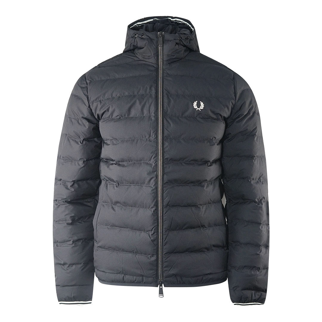 Fred Perry Black Insulated Hooded Jacket. Stay warm and stylish this season with the Fred Perry Black Jacket! This luxurious black jacket features a sleek silhouette and a sporty style featuring a tracksuit-inspired ribbed hem and cuff trims. Get ready to make heads turn wherever you go. Twin Tipped Design On Sleeve Endings and Inner Hood. Slim Fit, Central Zip Closure. Elasticated Sleeve and Hem, Branded Badge On Left Chest, Material: 100% Polyamide, Filling: 100% Polyester. Style: J4565 102