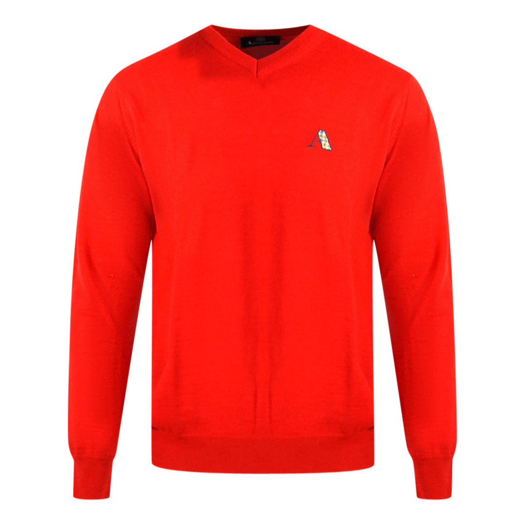 Aquascutum Check A Logo Red V-Neck Jumper. Aquascutum Check Logo Red Knitwear V-Neck Sweater. 50% Wool, 50% Acrylic. Branded A In Classic Check On Left Chest. Regular Fit, Fits True To Size. 2028 8A801201