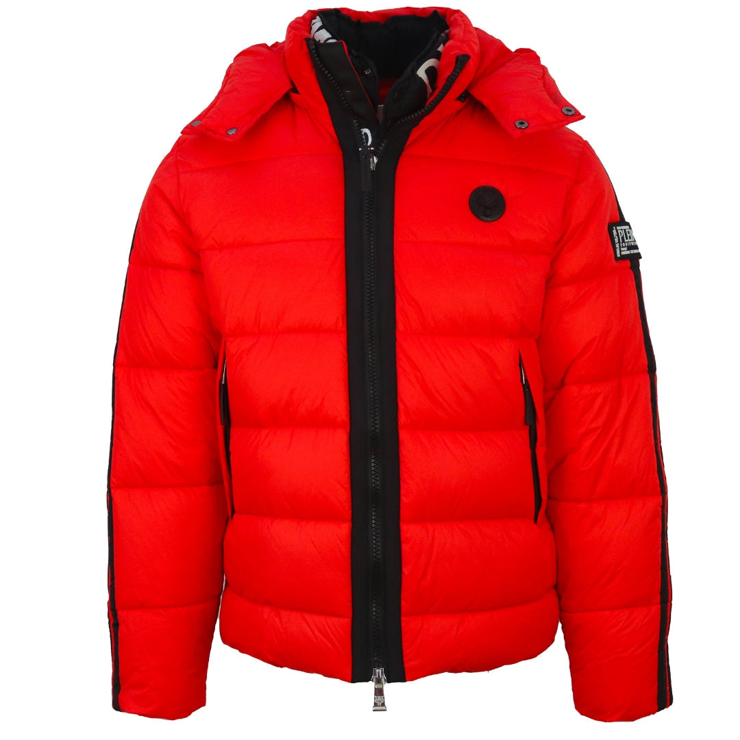 Plein Sport Padded Small Circular Logo Red Jacket. Stay warm and stylish with the Plein Sport Padded Circle Logo Red Jacket! Crafted with comfort in mind, this sleek Red jacket features padded lining and the signature Plein Sport circle logo. Enjoy superior warmth paired with timeless elegance!. Zip Closure Front Pockets, Patch On Chest, Central Zip Closure. Hooded Coat, Filling: 100% Polyamide, Lining : 100% Polyester. Padded Jacket, Zip Closure. Style: UPPS01F 52