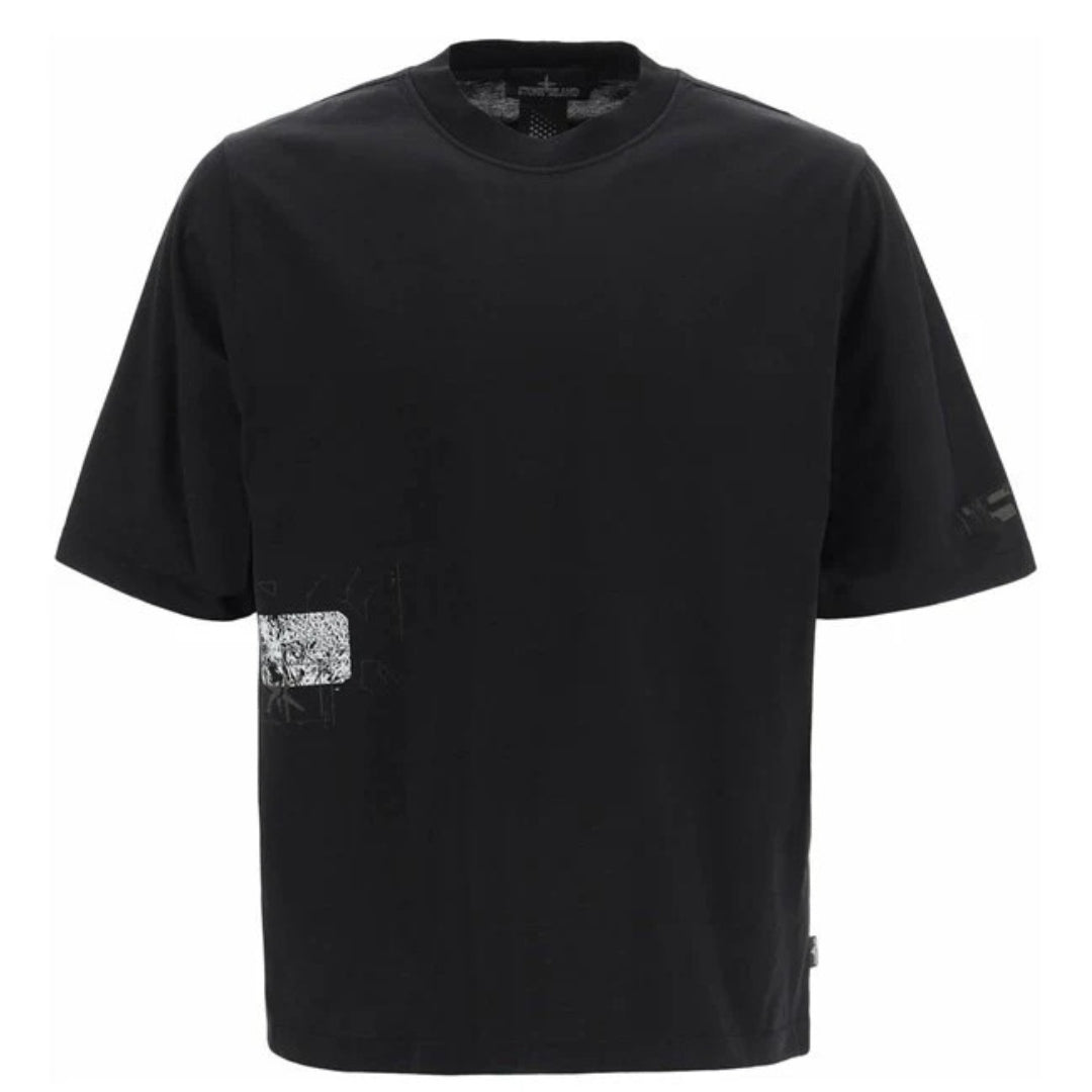 Stone Island Shadow Project Patch Design Black T-Shirt. This Stone Island T-Shirt features Patch logo Design, It's a stone island X shadow project short-sleeved tee. Perfect for casual wear or everyday occasions.. Regular Fit Style, Fits True To Size, Stone Island. 100% Cotton, Black tee With Short Sleeves. Design On Front, Crew Neck. 77192011B V0029