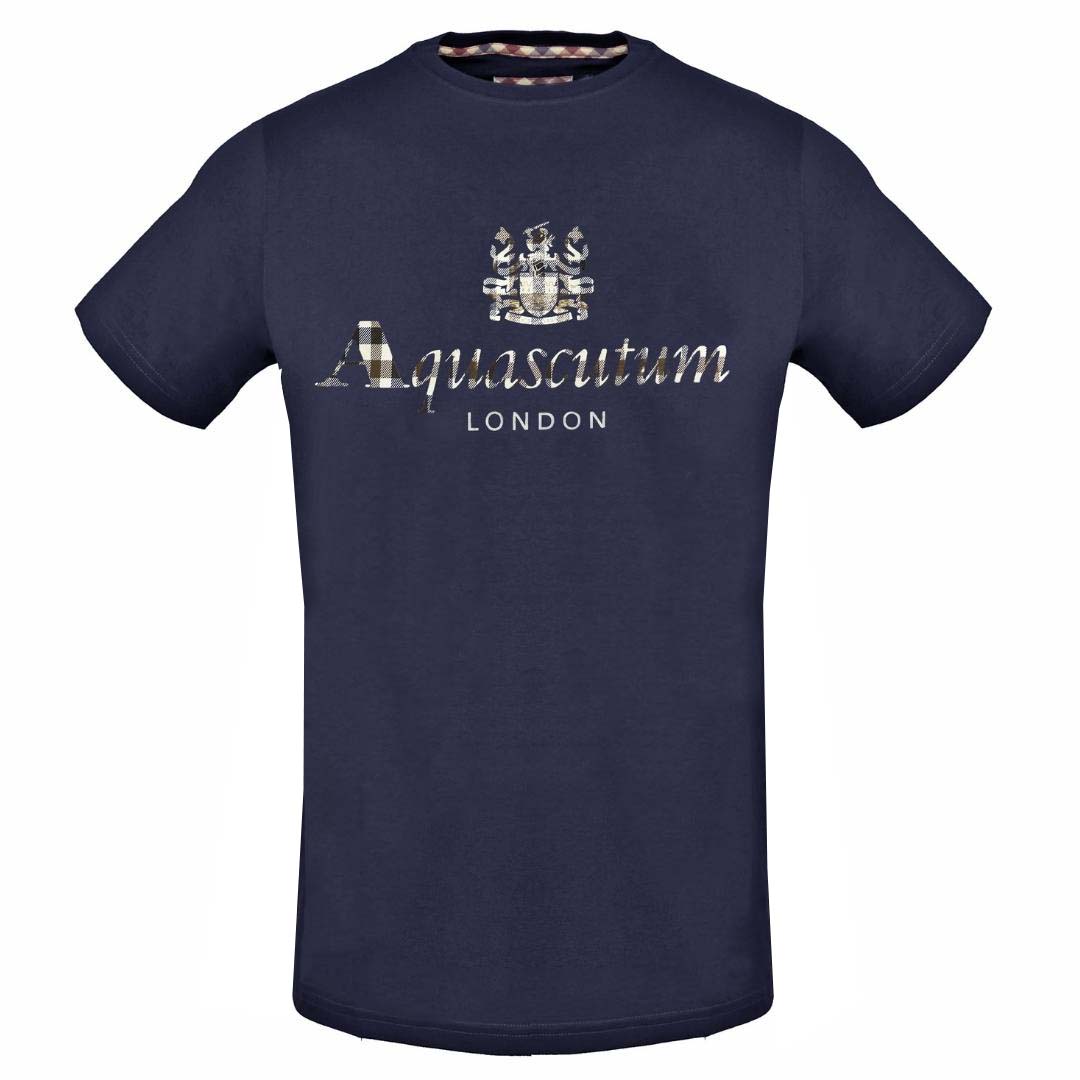 Aquascutum Classic Check Logo Navy Blue T-Shirt. Aquascutum Classic Check Logo Navy Blue Tee. Crew Neck T-Shirt, Short Sleeves. Stretch Fit 95% Cotton 5% Elastane. Regular Fit, Fits True To Size. Style TSIA01 85