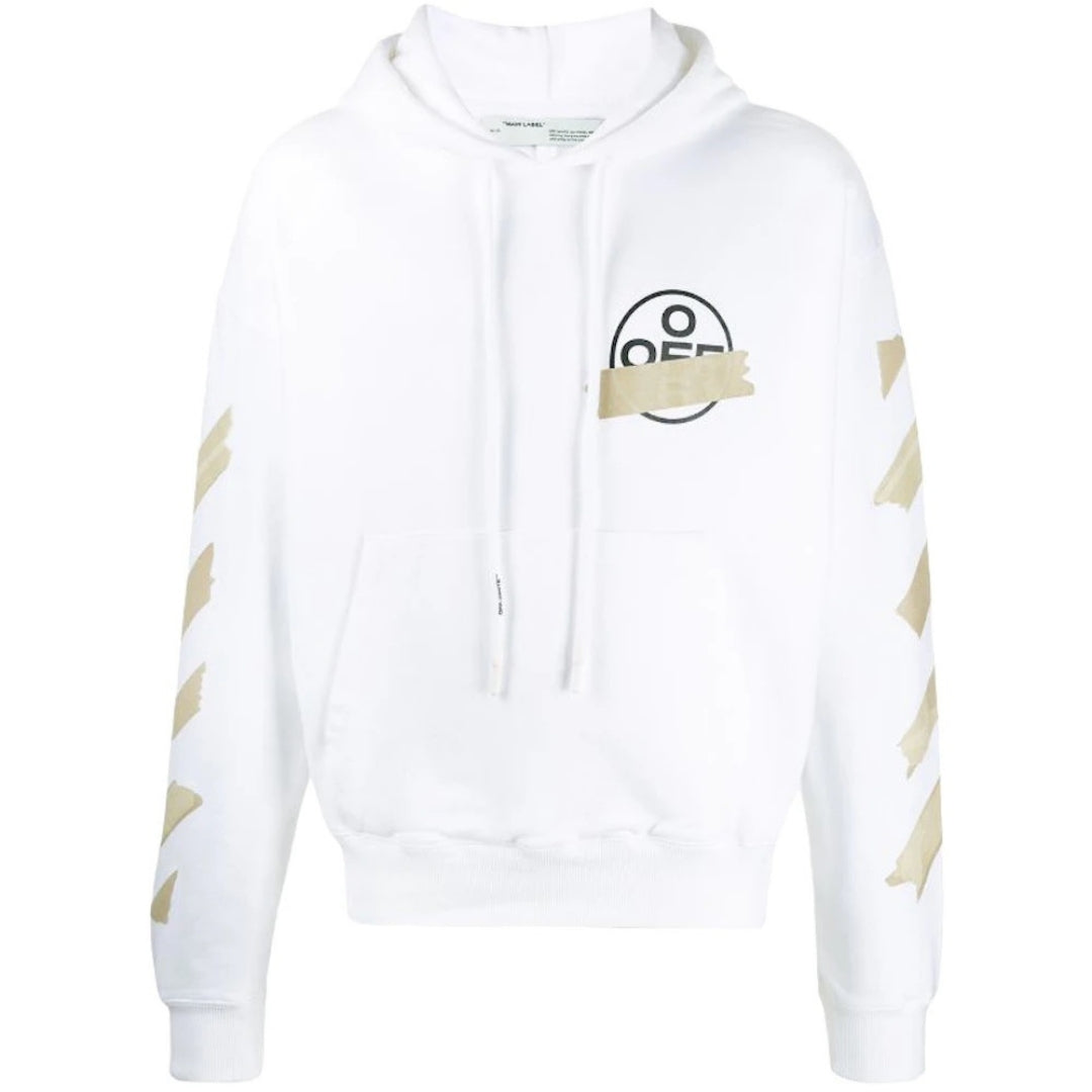 Off-White White Hoodie Tape Design Logo Elasticated Sleeve and Hem Endings, 100% Cotton Drawstring Adjustable Hood Style Code: OMBB034G20FLE0180161
