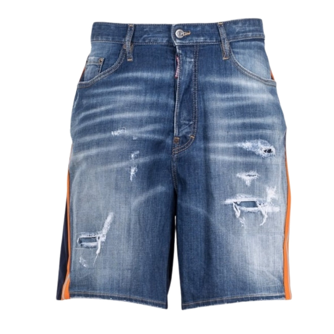 These Dsquared2 Boxer Style Shorts in blue denim combine comfort and style effortlessly. Crafted from 98% cotton with 2% elastane, they offer a soft, breathable feel with just the right amount of stretch for ease of movement. The taped hem adds a distinctive, modern touch, making these shorts perfect for casual outings or relaxed weekends. Designed for men who appreciate quality and contemporary fashion, these shorts deliver both durability and a flattering fit. Elevate your summer wardrobe with these versatile, stylish denim shorts that blend classic materials with a fresh, sporty design.