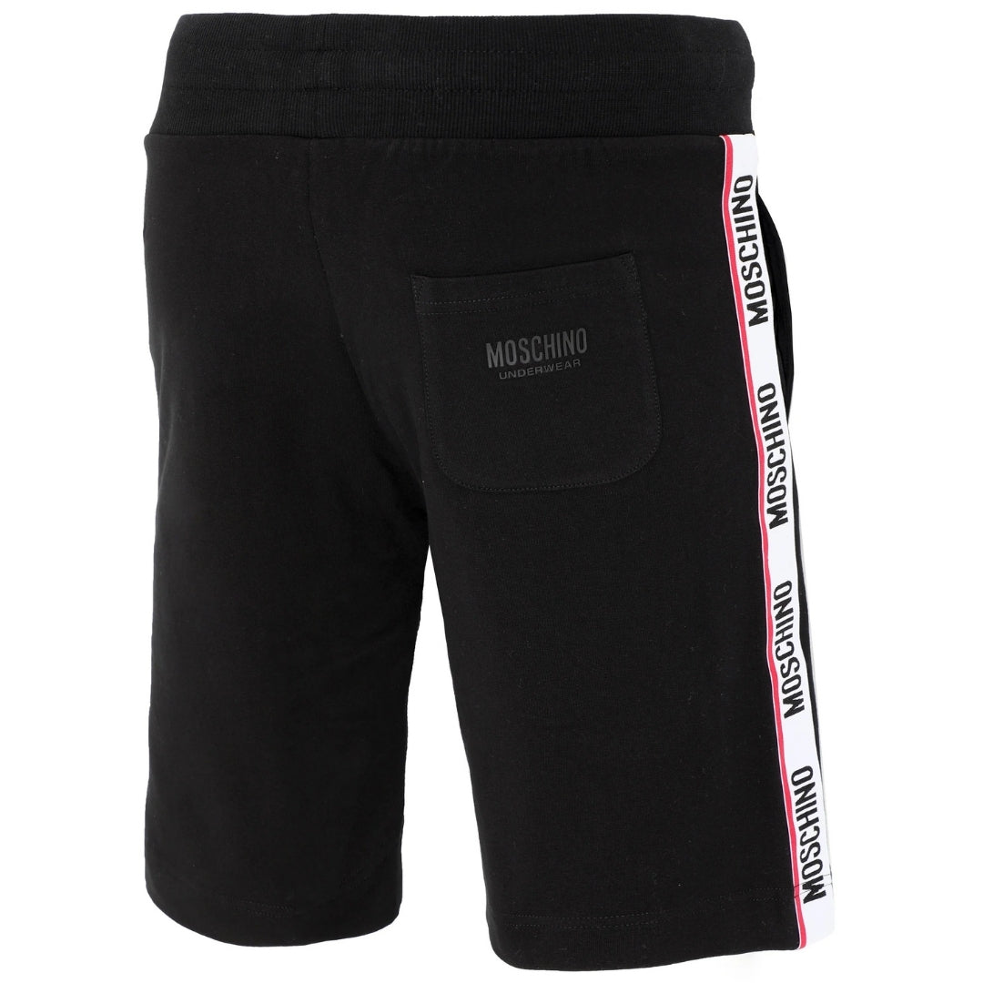 Moschino Black Shorts, Tape Logo Down Legs, Elasticated Waist, Comfortable Stretch Fit, 95% Cotton, 5% Elastane, Back Pocket, Drawstring Ties, Moschino Loungewear, Taped Branding, Monotone Logo On Pocket